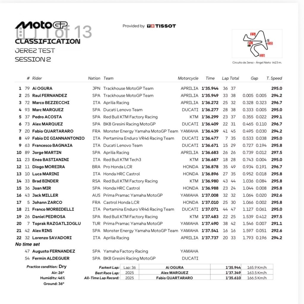 Čempionato lyderis M. Bezzecchi bandymus baigė trečias, o ketvirtoje vietoje liko M. Marquezas, Jereze išbandęs naują aerodinamikos paketą. Penketuką užbaigė P. Acosta.