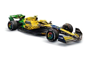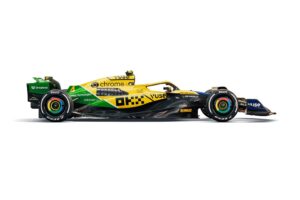 Britų komanda, kartu su savo rėmėju „OKX“, nusprendė visiškai atsisakyti įprastos papajų oranžinės spalvos ir įkvėpta legendinio Ayrtono Sennos automobilį šiam savaitgaliui išdažyti geltona, žalia ir mėlyna spalvomis. Būtent tokiomis spalvomis praeityje buvo išdažytas A. Sennos šalmas.