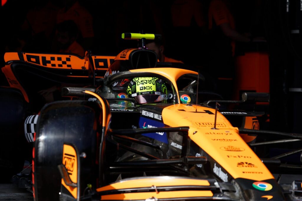 Antrąją važiavimų dalį geriausiai pradėjo „McLaren“ sportininkai. Važiavimams įpusėjus, pirmoje vietoje atsidūrė Lando Norrisas, ratą įveikęs per 1 min. 10,496 sek., o antroje – jo komandos draugas Oscaras Piastri, buvęs vos 0,009 sek. lėtesnis.