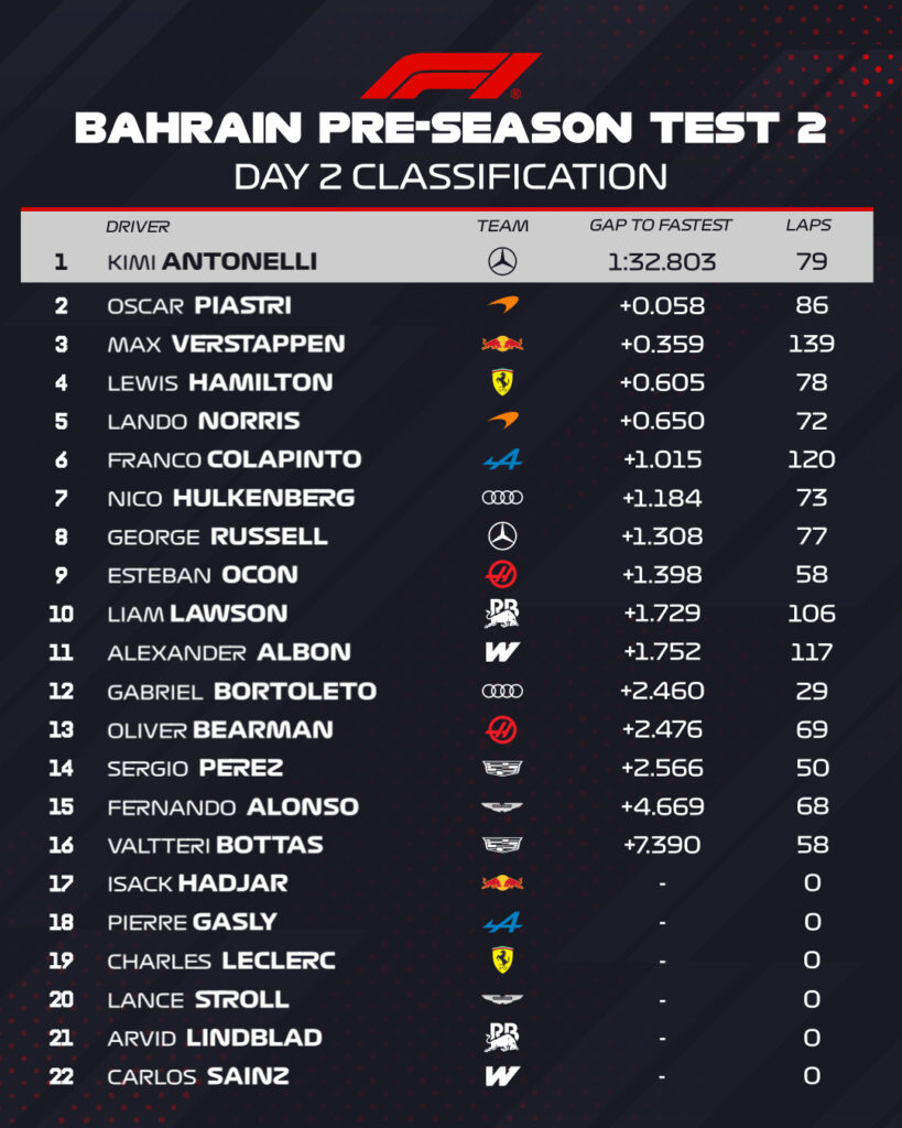 Penktąją Bahreine vykstančių F-1 bandymų dieną geriausią rezultatą tarp visų dalyvių užfiksavo „Mercedes“ sportininkas Andrea Kimi Antonelli.