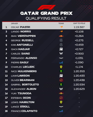 Likus kelioms minutėms ir sportininkams sugrįžus į trasą, L. Norrisas padarė klaidą. Tuo pasinaudojo O. Piastri, kuris pagerino savo rezultatą ir užfiksavęs geriausią rato įveikimo laiką iškovojo „pole“ poziciją.