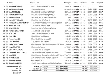 Ispano komandos draugas Ferminas Aldegueris užfiksavo ketvirtą rezultatą, o greičiausiųjų penketuką užbaigė KTM komandos narys Pedro Acosta, kuris kartu su M. Vinalesu išbandė naujus aerodinamikos elementus.
