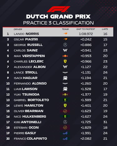 Šį kartą niekas neprilygo britų komandai ir jos atstovui. Antroje vietoje likęs čempionato lyderis O. Piastri buvo dviem dešimtosiomis sekundės dalimis lėtesnis, o trečioje vietoje likęs George‘as Russellas iš „Mercedes“ buvo net 0,8 sek. lėtesnis už L. Norrisą.
